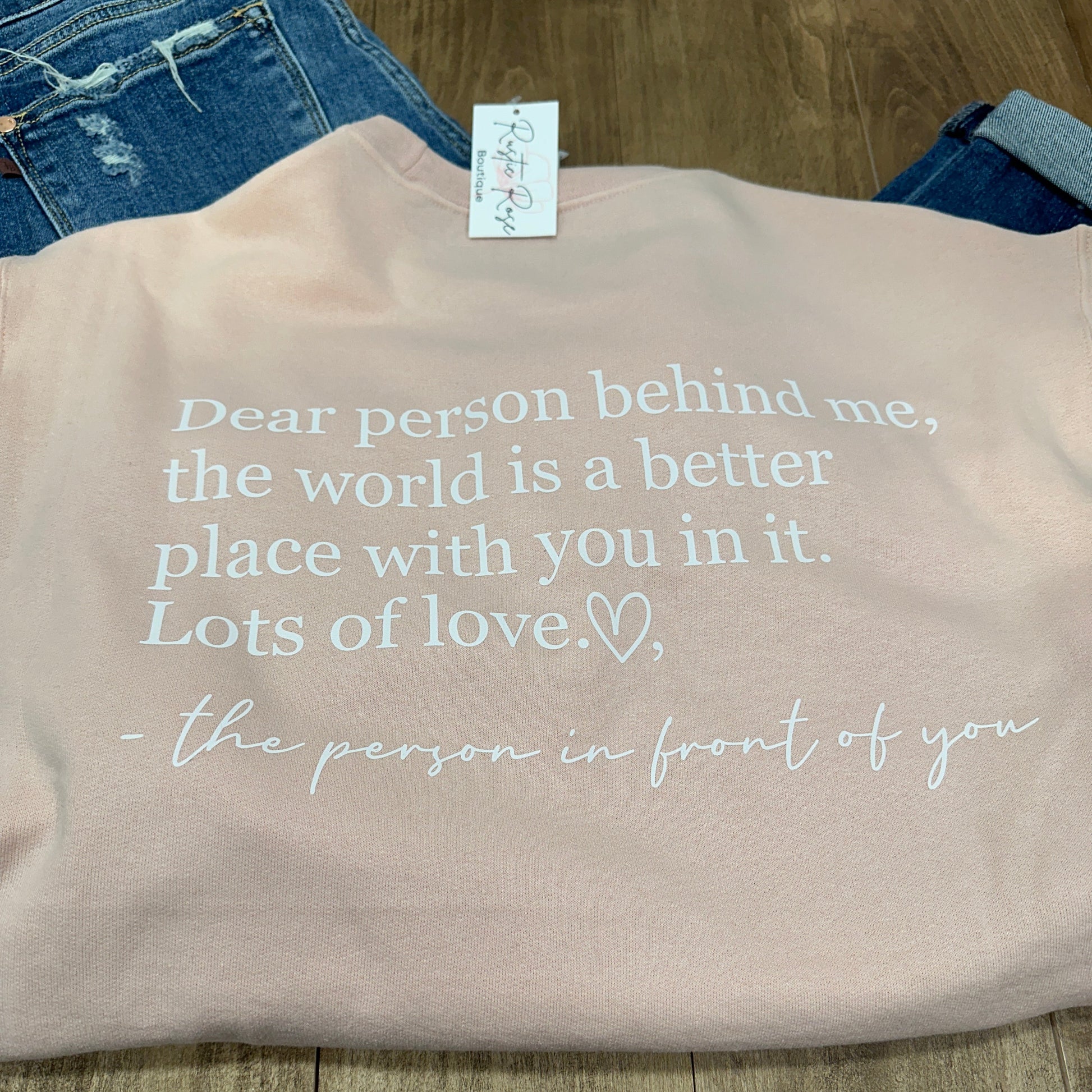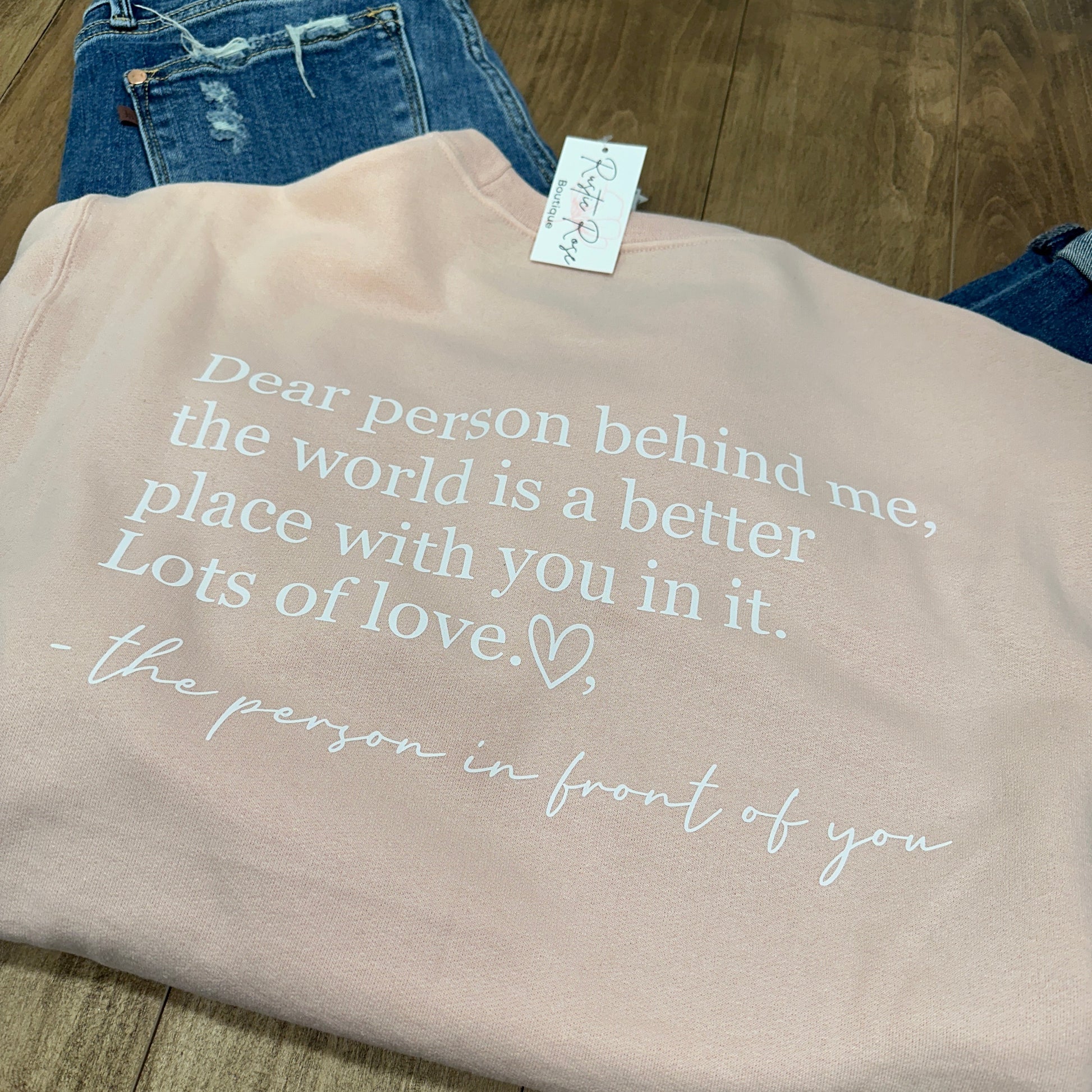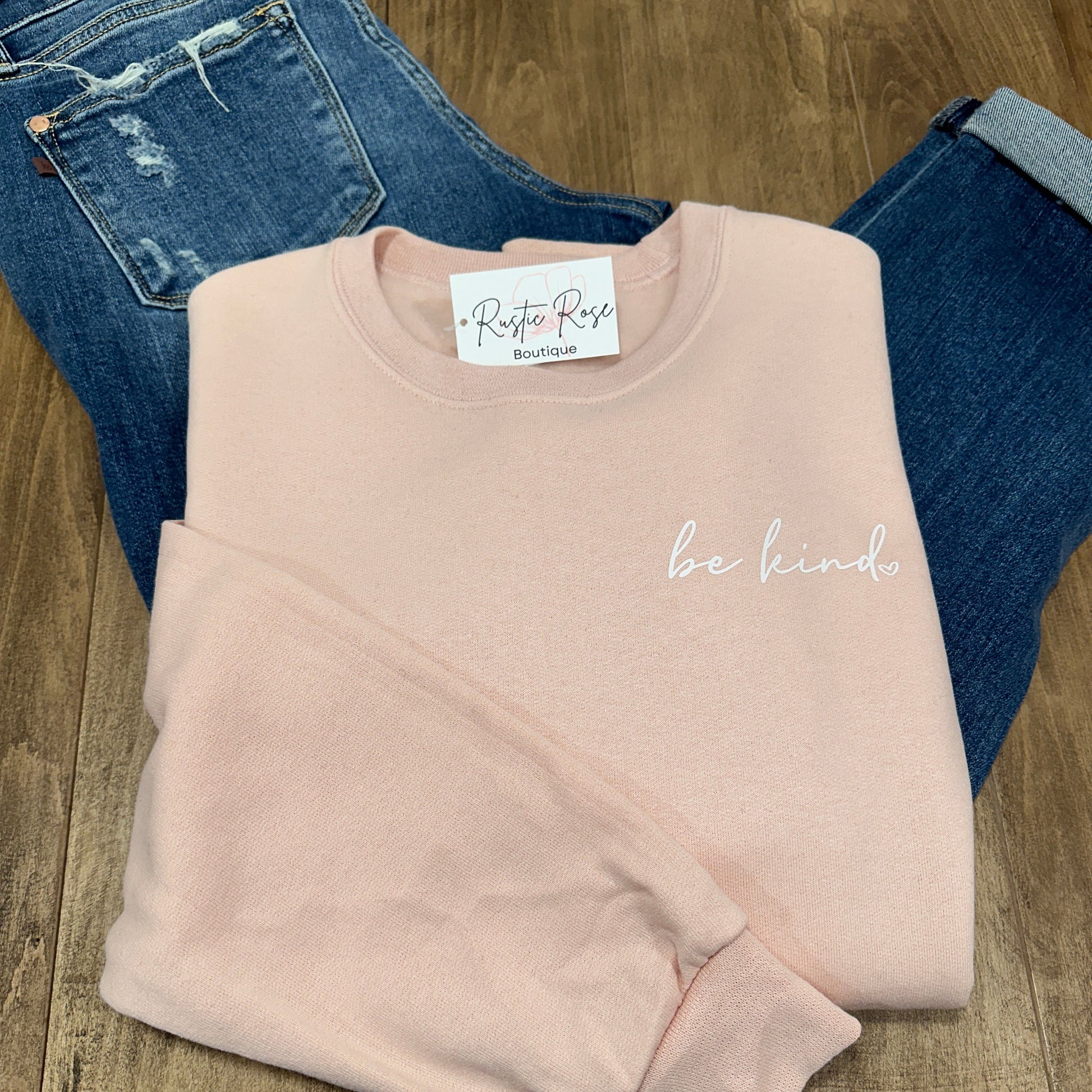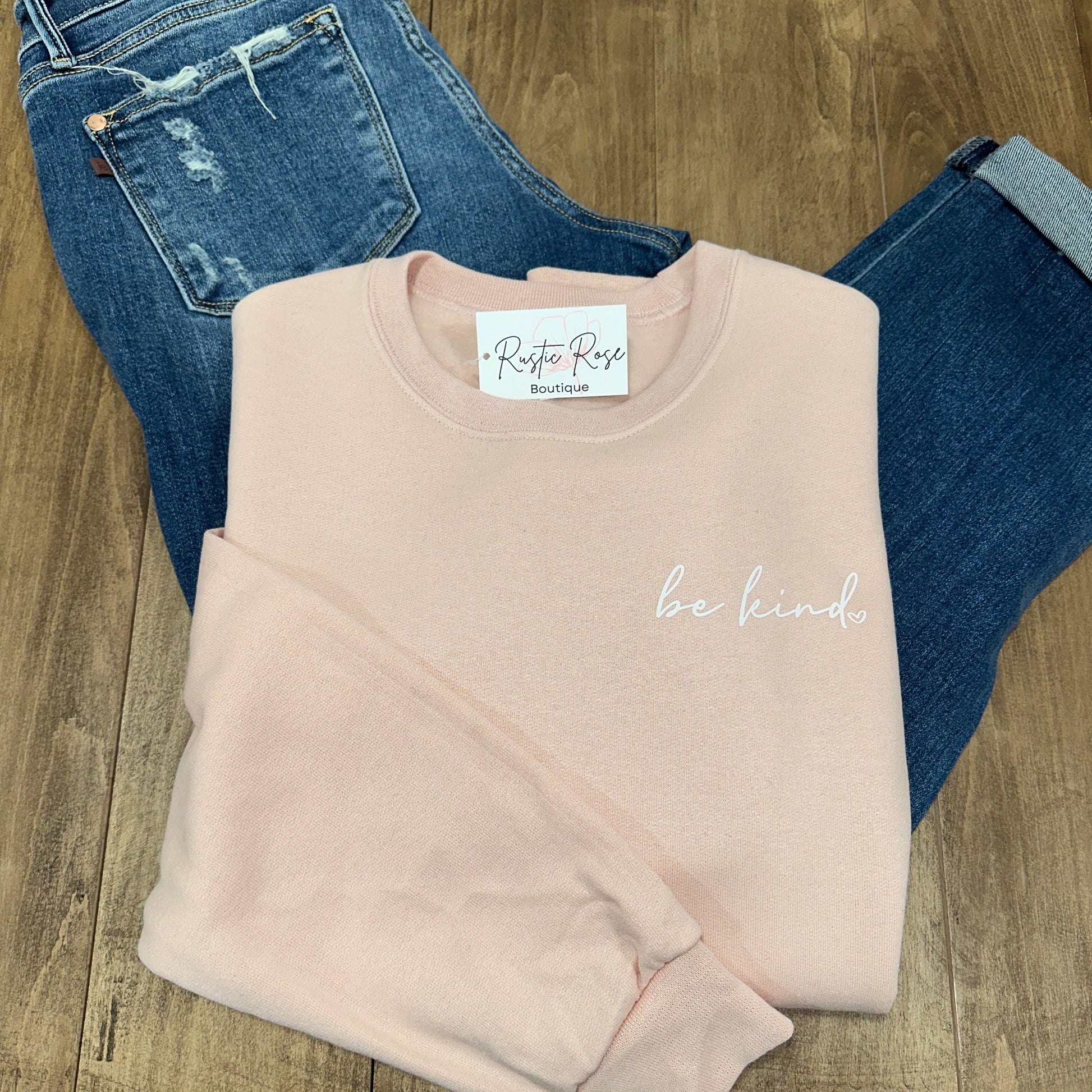 our light pink be kind sweatshirt features a front and back design with the simple yet powerful message to "be kind." This crewneck sweatshirt serves as a stylish reminder to spread kindness wherever you go. Let your actions speak louder than words.