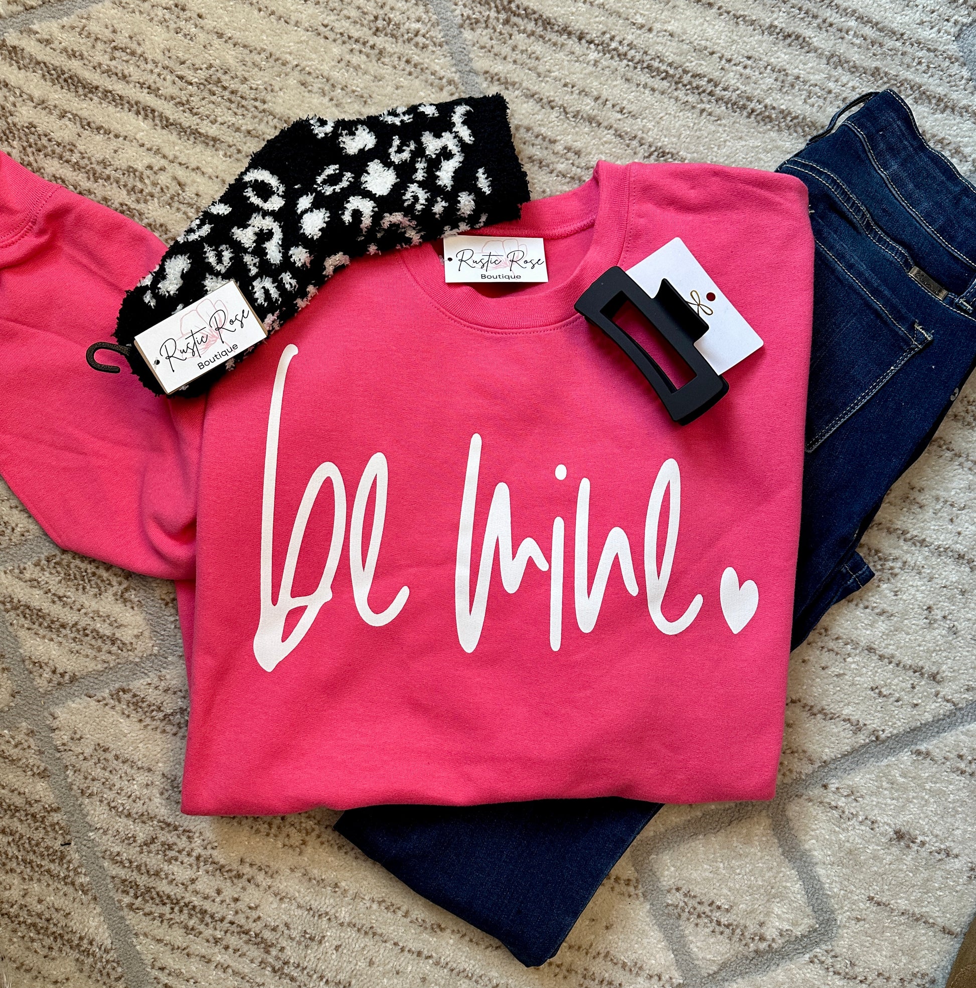 Stay cozy and comfortable in our Be Mine Crew sweatshirt. Perfect for a casual Valentine's Day, this sweatshirt adds a touch of romance to your wardrobe. Soft and warm, it's the perfect choice for a cozy night in with your loved one.