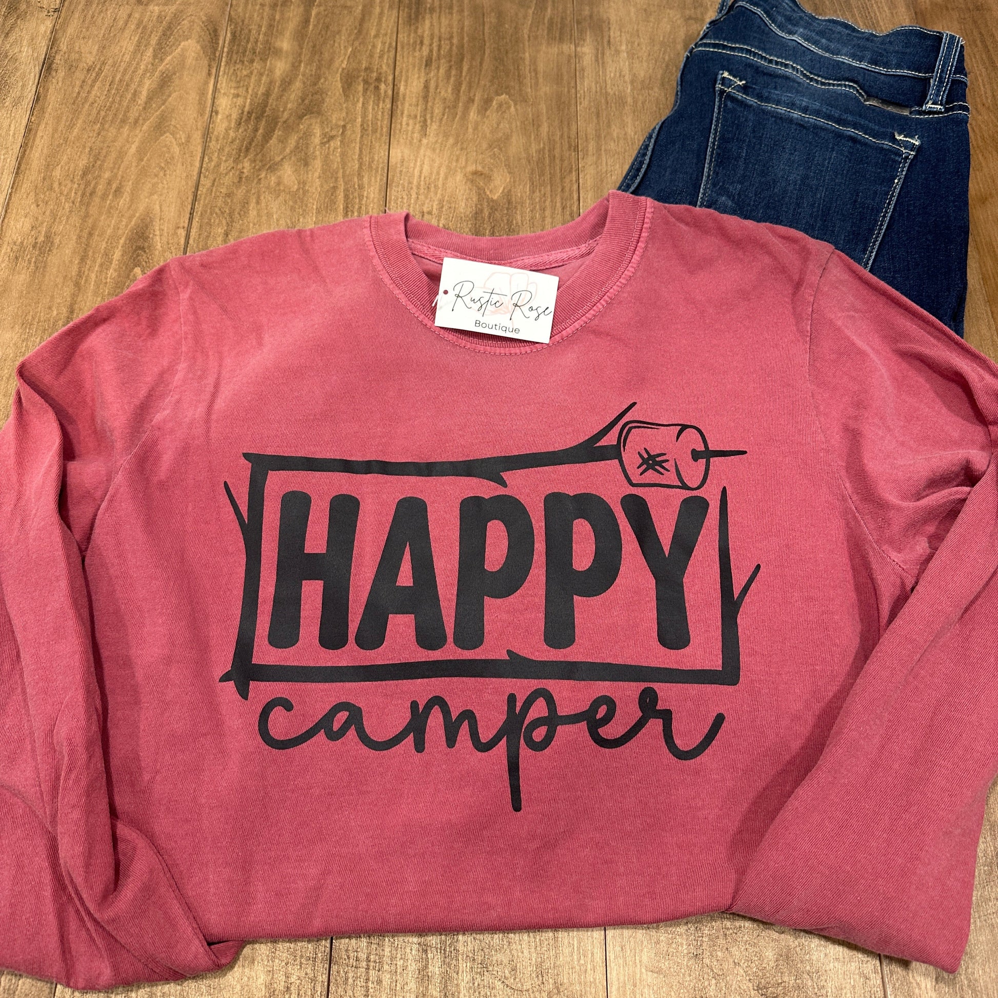 The Happy Camper long sleeve shirt is Comfort Colors brand offers soft, breathable fabric ideal for camping trips. Its relaxed fit ensures comfort during outdoor activities, making it a great choice for cool evenings by the campfire or casual wear on your adventures.
