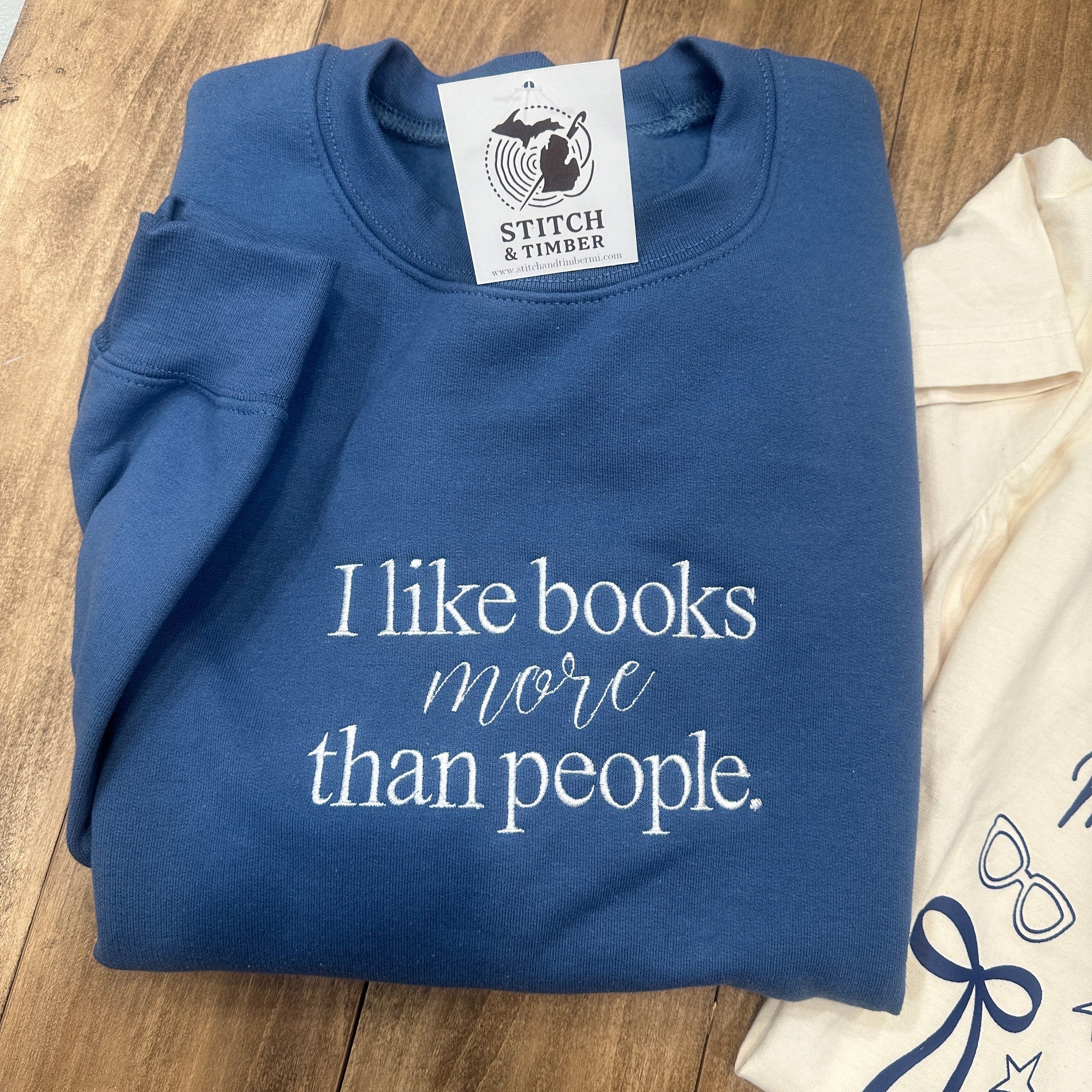 This cozy crewneck sweatshirt features an embroidered phrase "I like books more than people," perfect for book lovers and bookish girls. Soft and comfortable, it’s ideal for curling up with your favorite read or casual everyday wear.